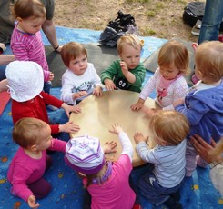 Durch musikalische Kinderspiele, Tänze und das gemeinsame Singen erfahren die Kinder eine frühe musikalische Förderung.